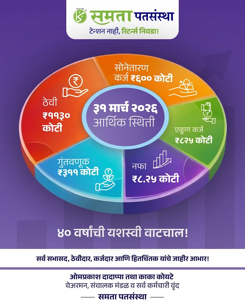 आर्थिक वर्ष अखेर समता पतसंस्थेची आर्थिक पत्रके ३१ मार्चला जाहीर करण्याची परंपरा गेल्या ४० वर्षापासुन कायम राखली असुन याही वर्षी ३१ मार्च २०२६ ला शासकीय सुटटी असल्याने दि.३० मार्चला आर्थिक पत्रके जाहीर करत असुन समताच्या लिक्वीडीटी बेस्ड प्रोटेक्शन स्किम अंतर्गत ९९.९४% ठेवीदारांच्या ६० लाख रुपयांपर्यंत ठेवी सुरक्षित आहे असे समताचे संचालक श्री.संदीप कोयटे यांनी सांगितले.